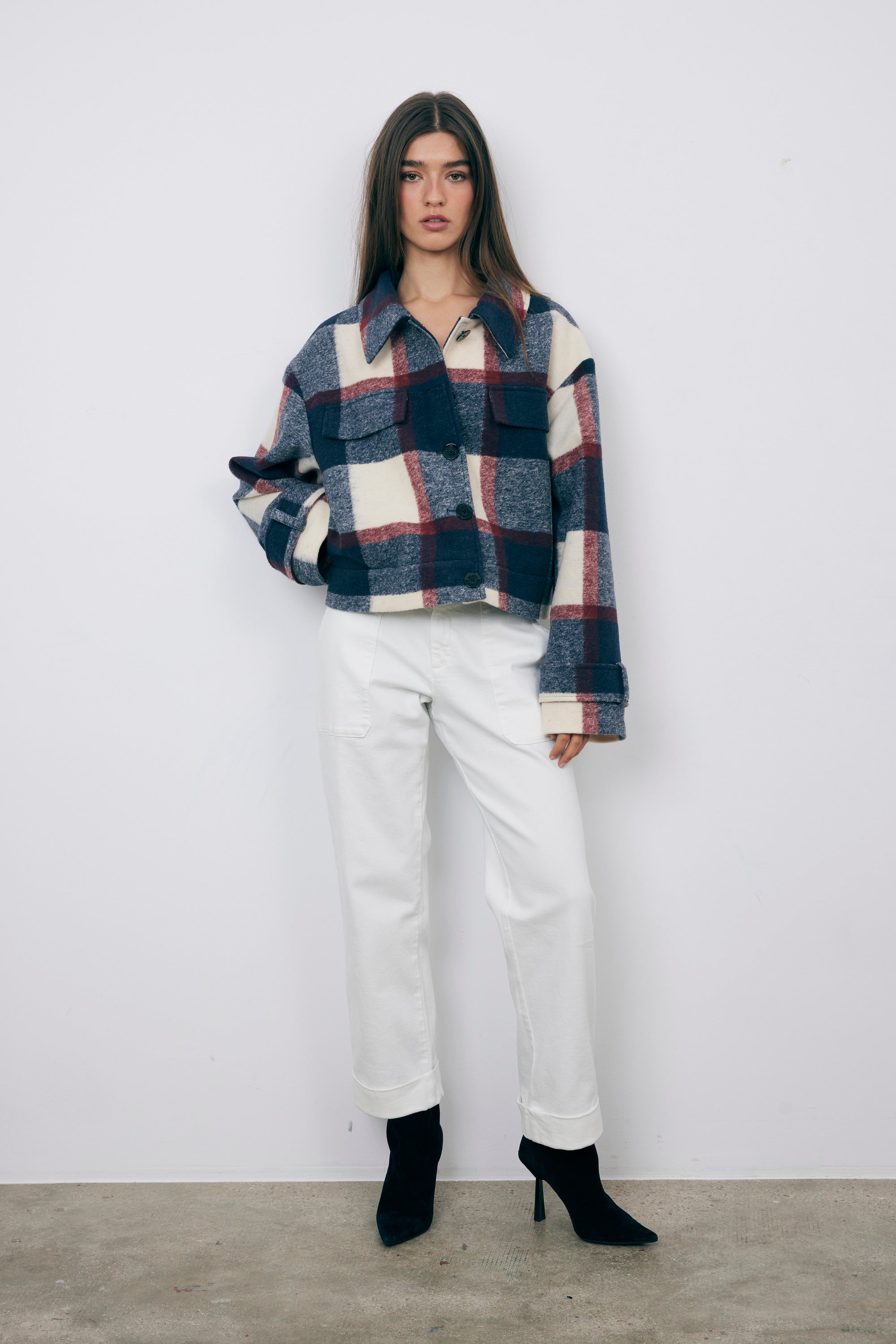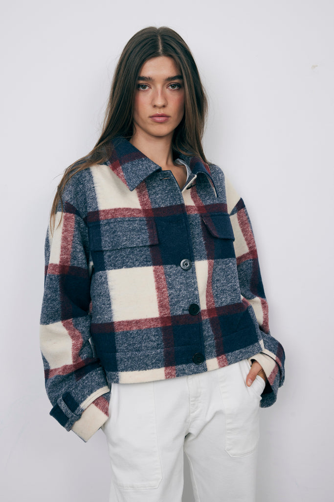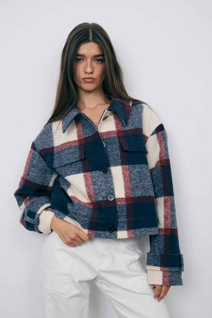 Abrigo Colección Bad Habits. Abrigo corto con estampado de cuadros en azul y burgundy, perfecto para añadir color y personalidad a tus looks de invierno.