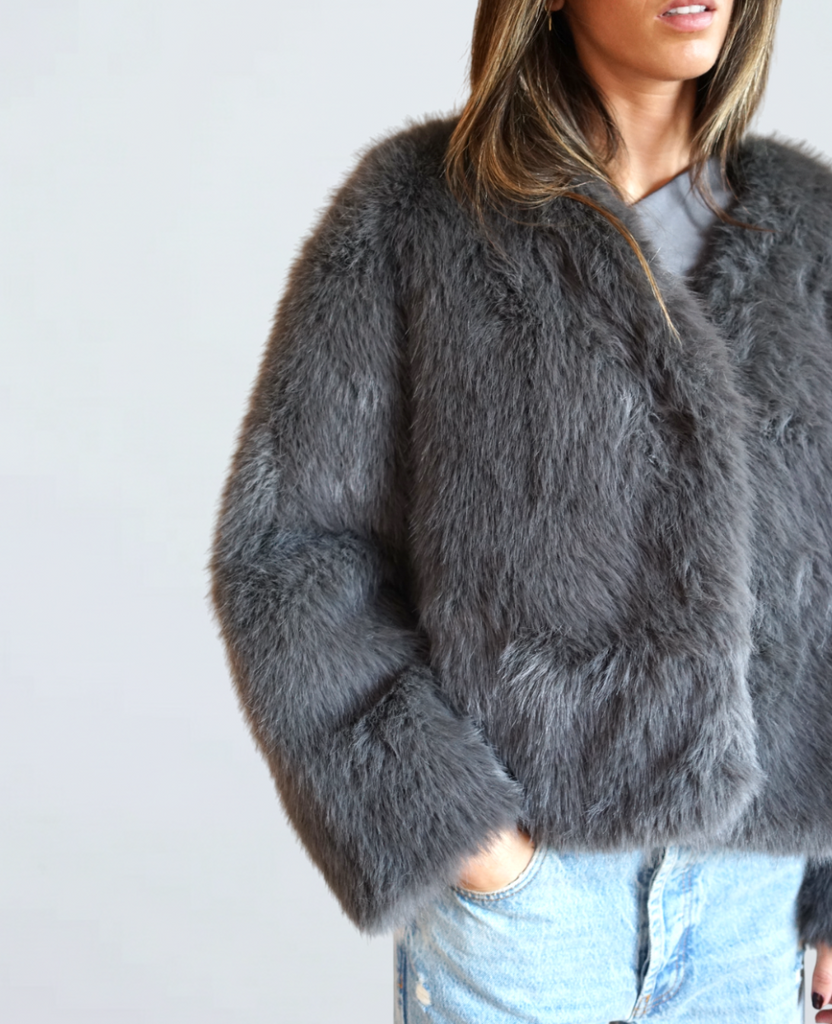 Abrigo Colección Bad Habits. Abrigo corto de pelo sintético con cuello redondo y cierre de corchete, ideal para aportar textura y calidez a tus looks.