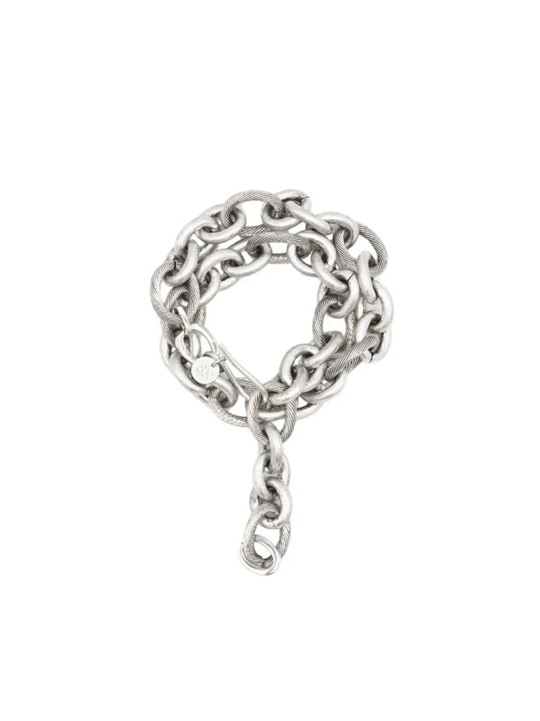 Pulsera de anillas lisas y rayadas, hecha para ser llevada con dos vueltas alrededor de la muñeca. El cierre de gancho permite ajustar la medida al tamaño deseado.