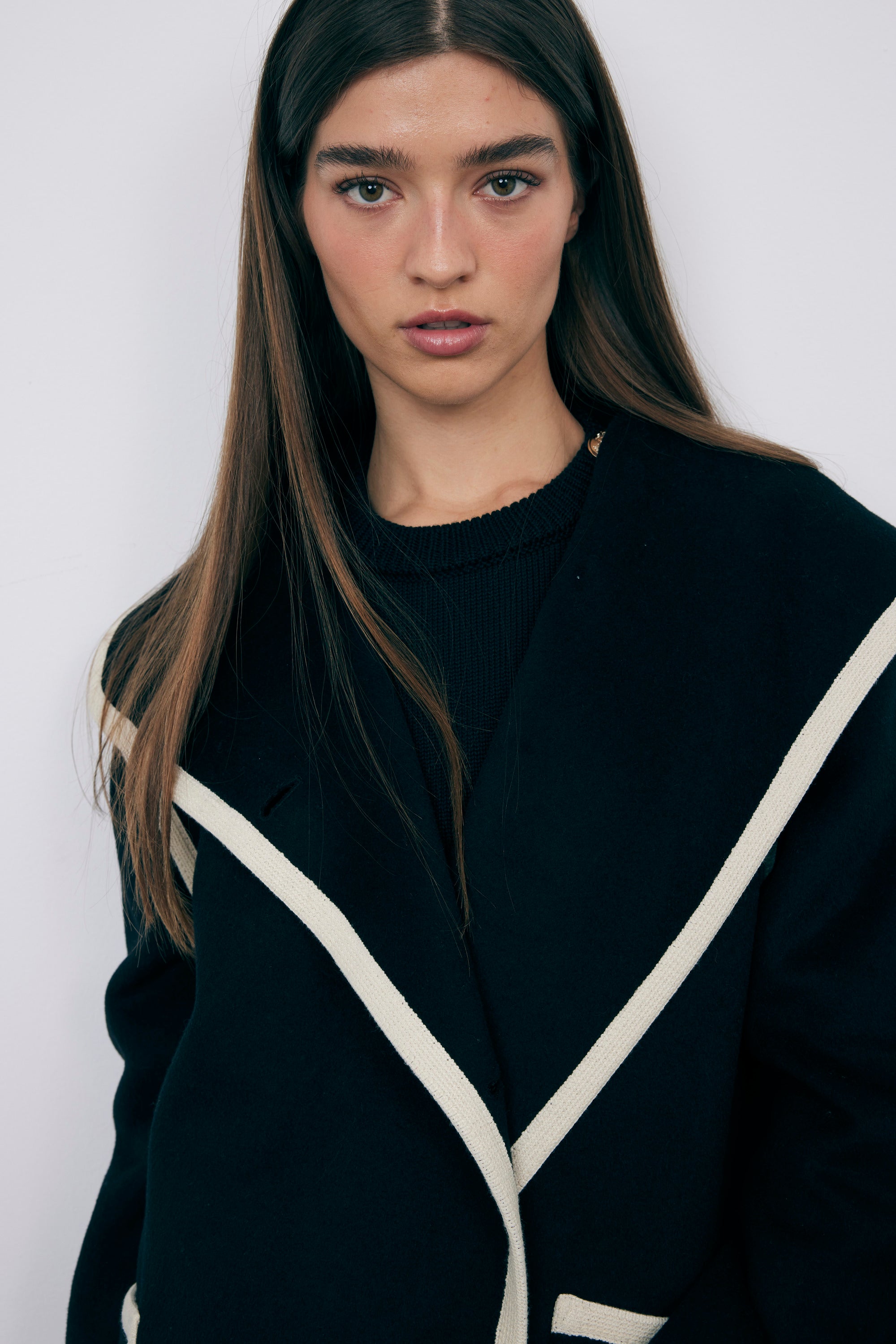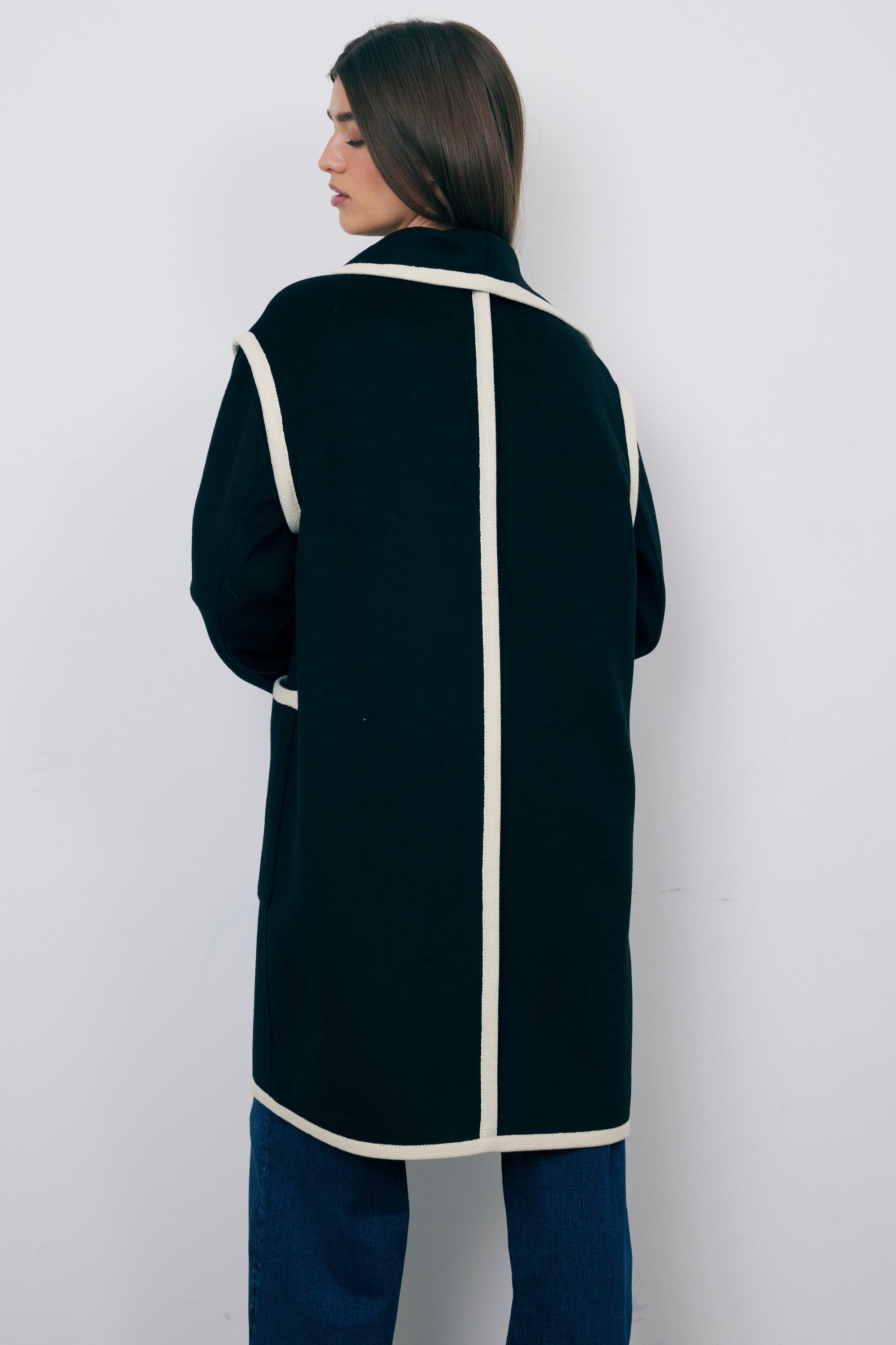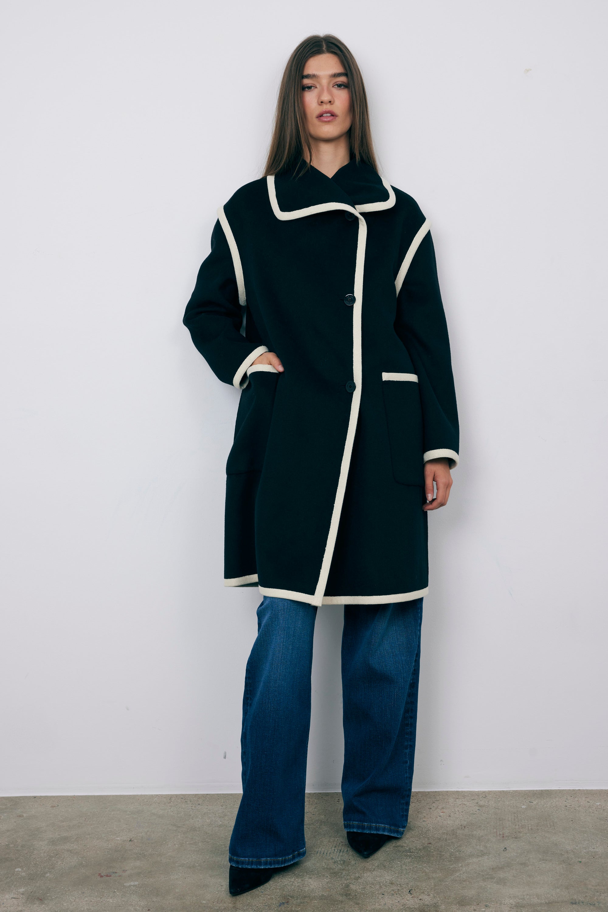 Abrigo Colección Bad Habits. Abrigo largo con cuello subido y detalles de vivos a contraste, ideal para un look estructurado y sofisticado.