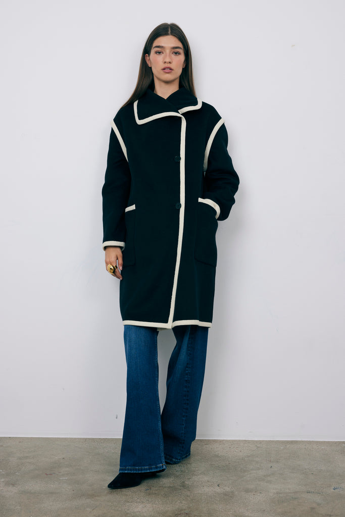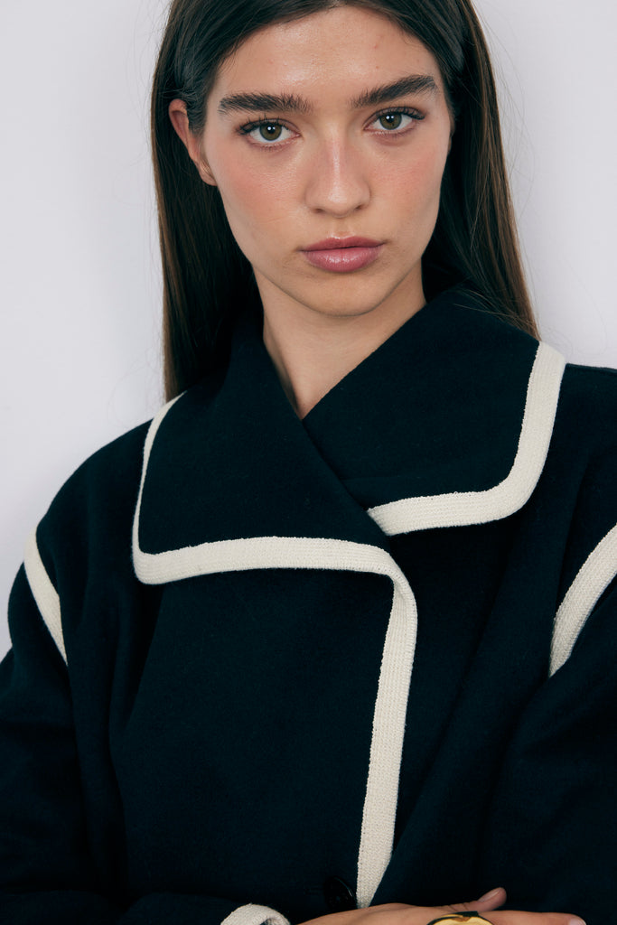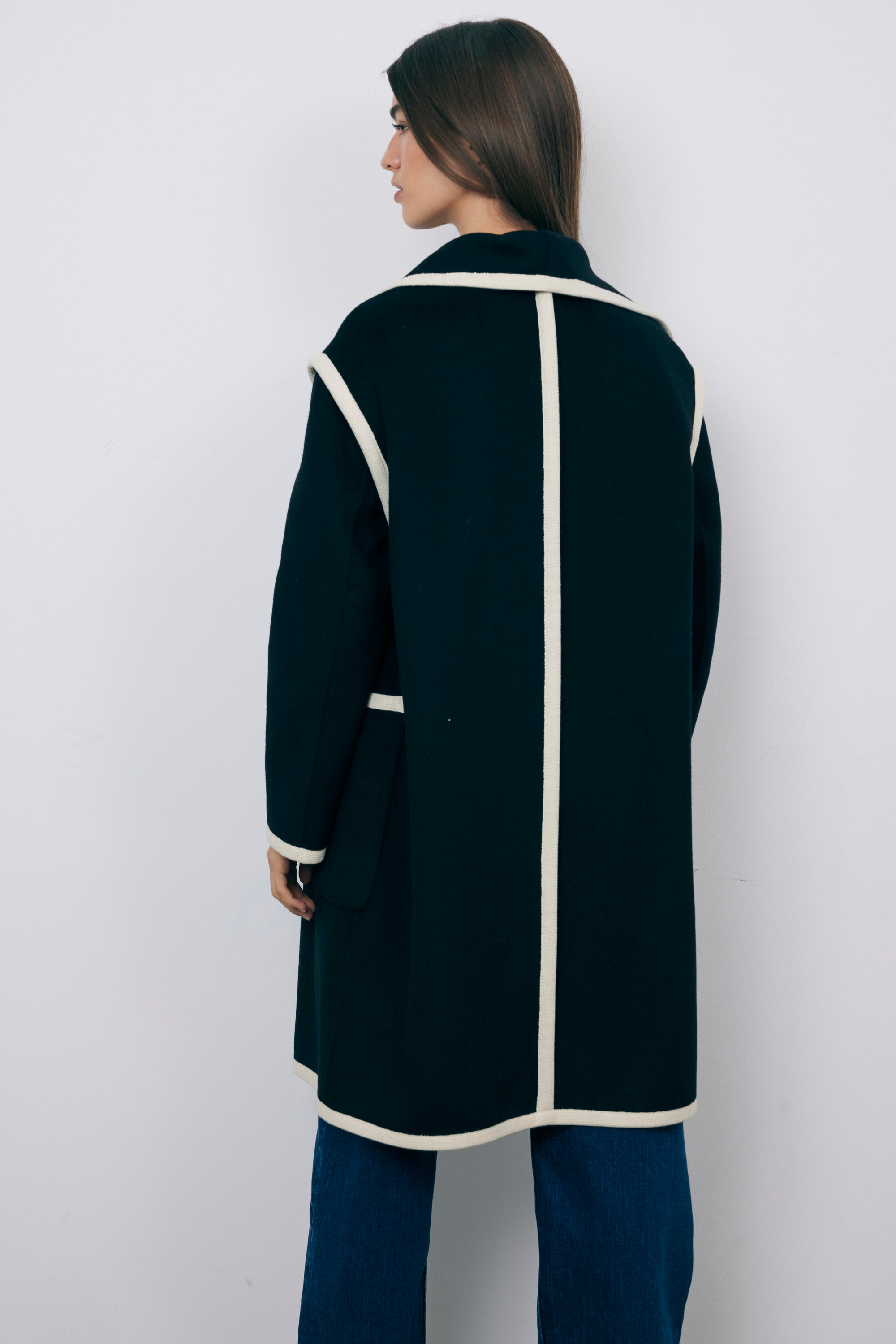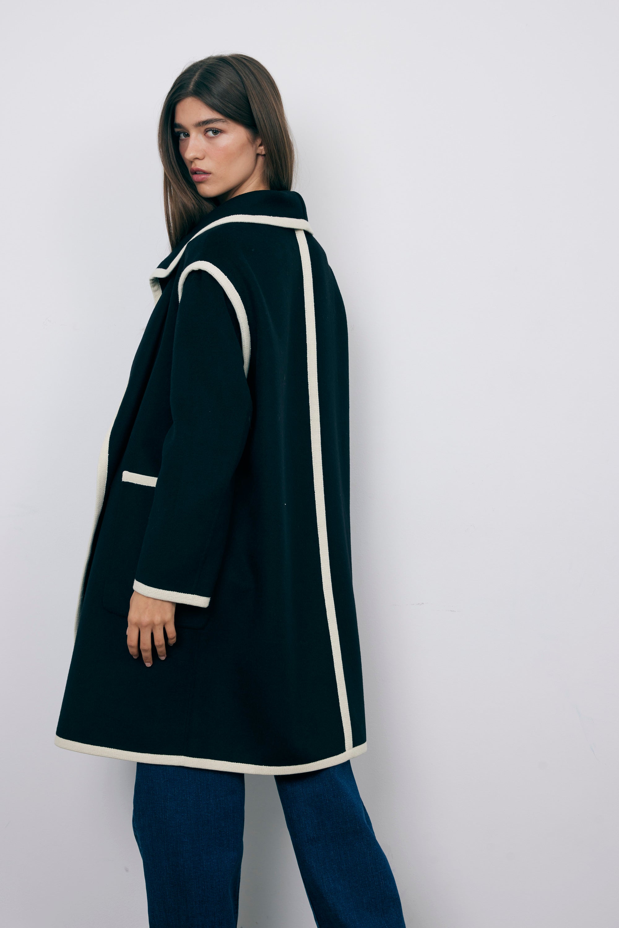 Abrigo Colección Bad Habits. Abrigo largo con cuello subido y detalles de vivos a contraste, ideal para un look estructurado y sofisticado.