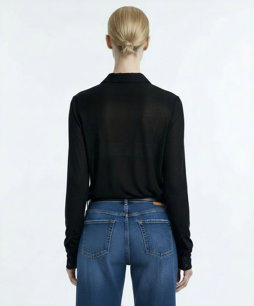 Camisa polo semitransparente de manga larga negra. Tejido de modal con elastano.