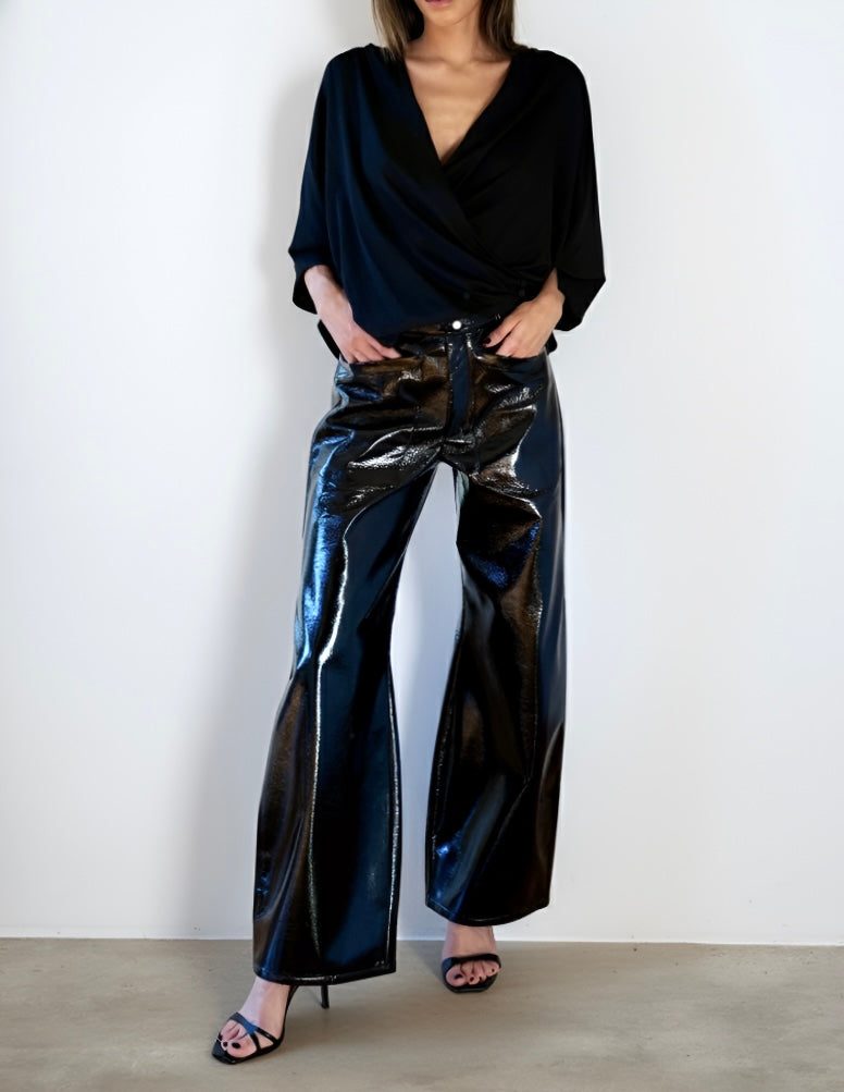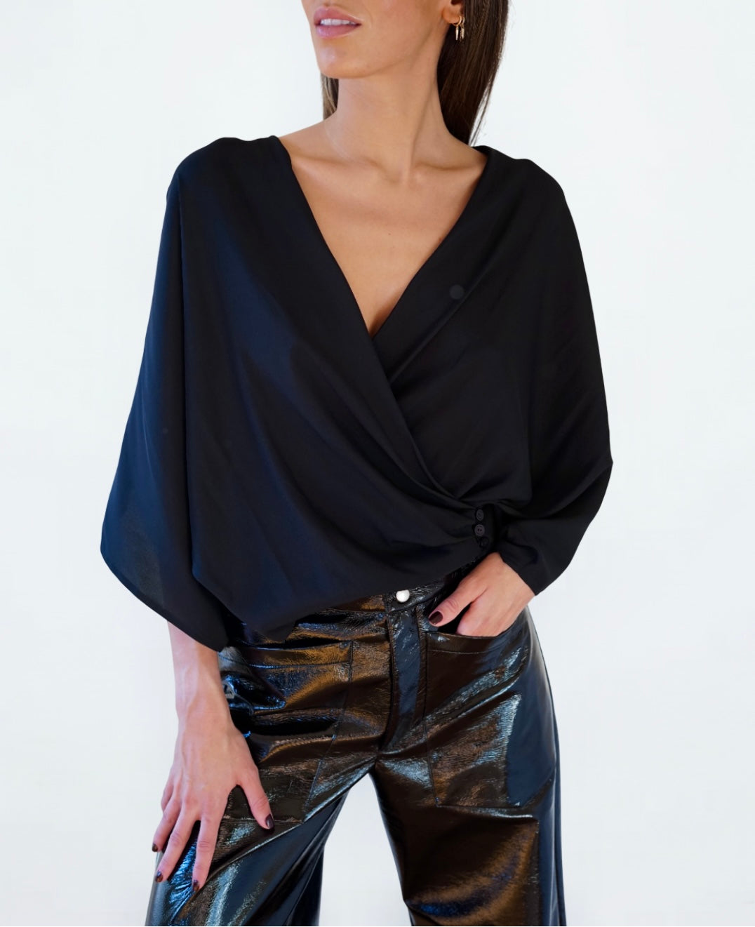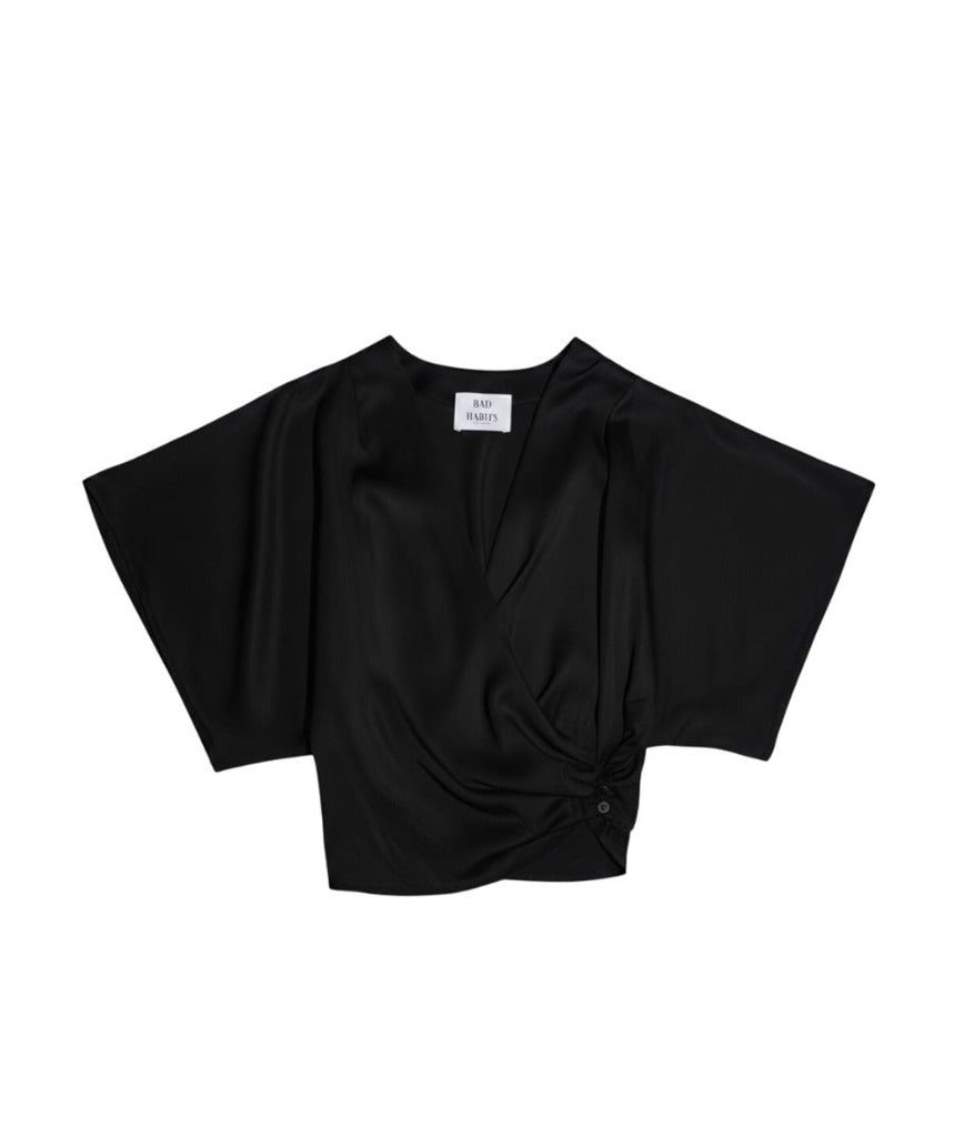 Top 100% seda Colección Bad Habits. Top con cierre cruzado con botones y escote en pico. Manga corta kimono.