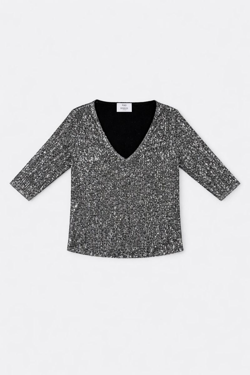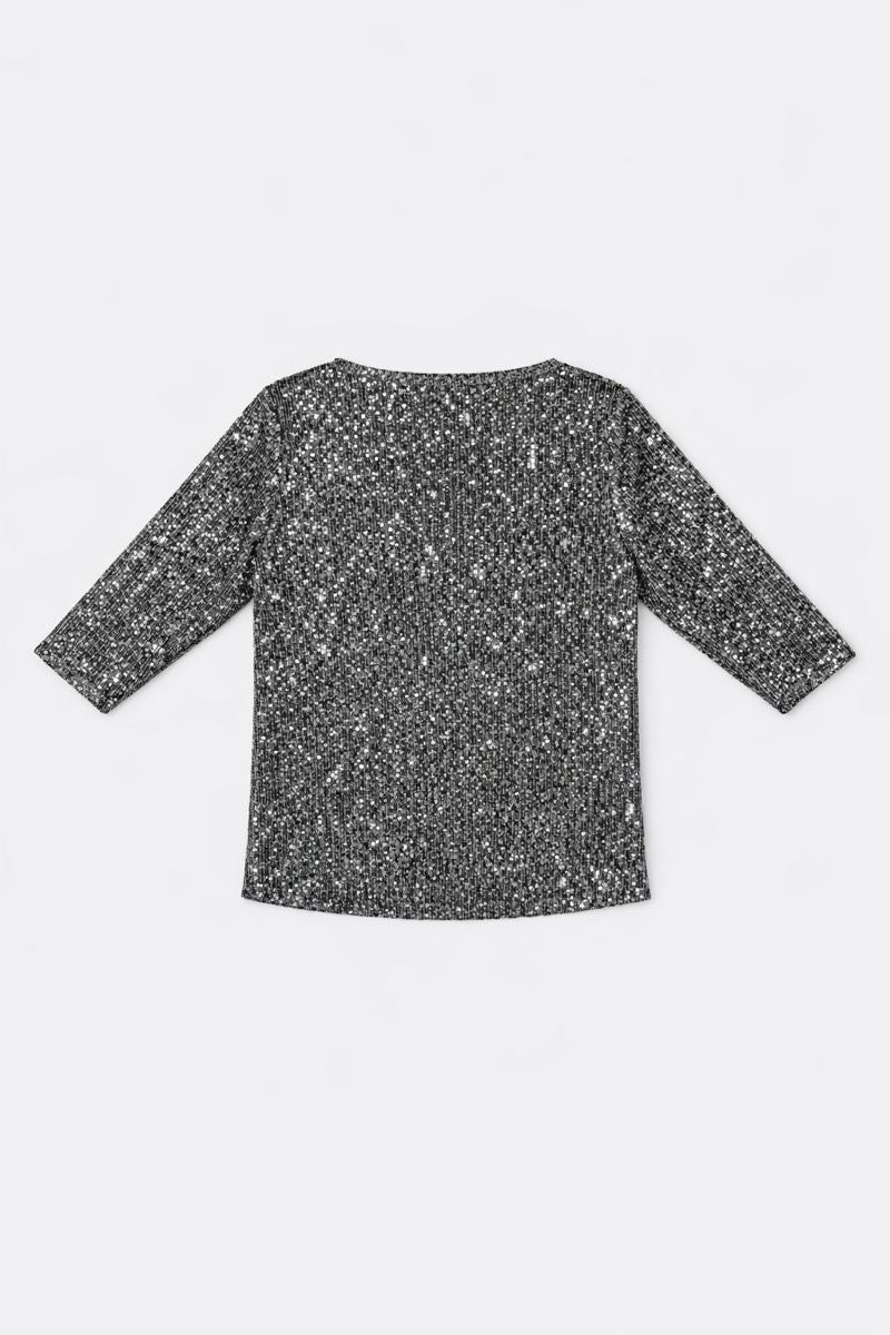 Dale un toque deslumbrante a tu estilo con este top brillante plateado. Su corte holgado y diseño de lentejuelas lo convierten en la prenda perfecta para combinar comodidad y glamour. Con escote en V y mangas tres cuartos, es ideal tanto para una noche de fiesta como para elevar tus looks diarios con un toque atrevido y sofisticado.