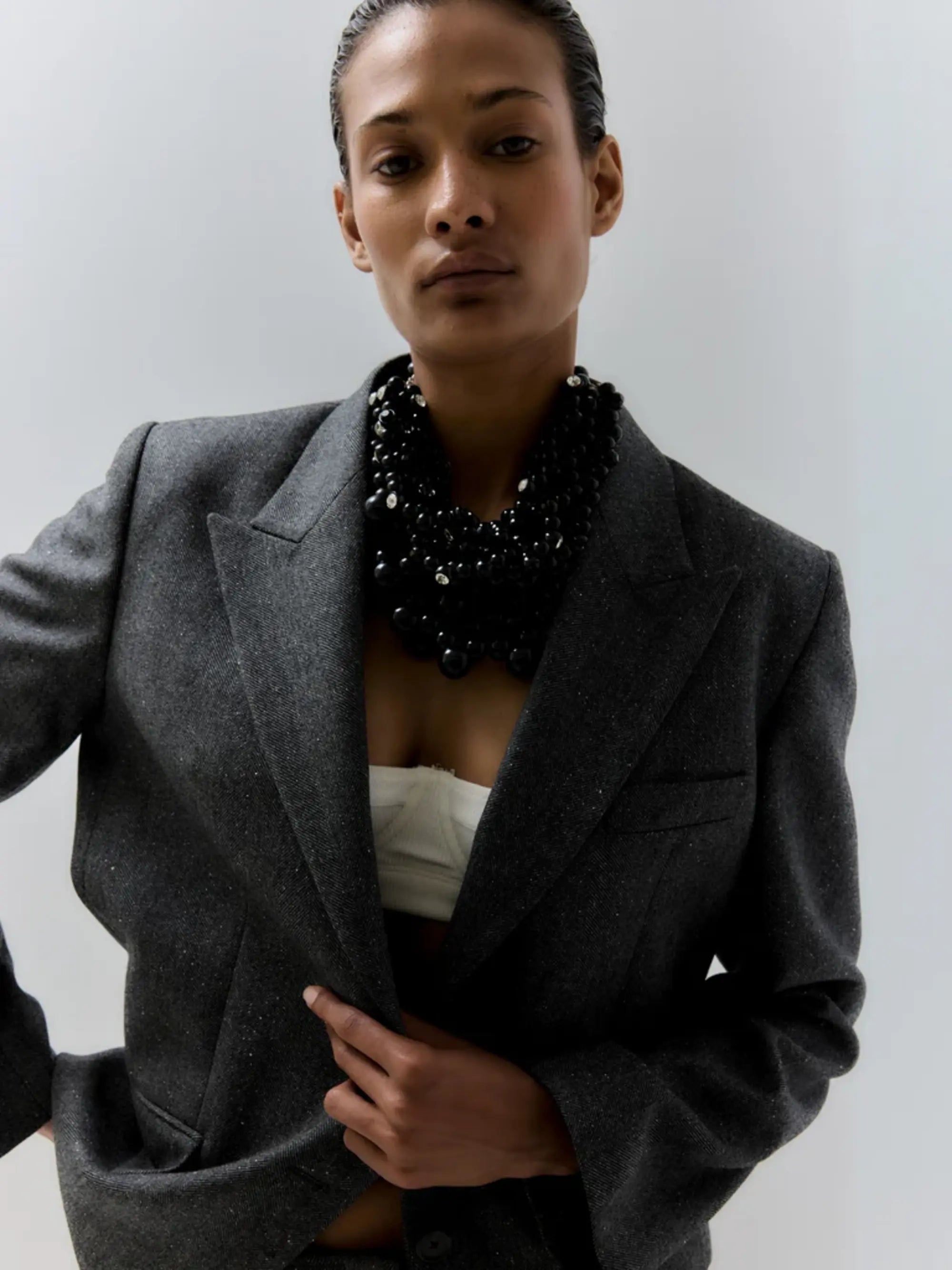 Collar corto, hecho con cinco tiras de bolas de resina y cascarillas de cristal.