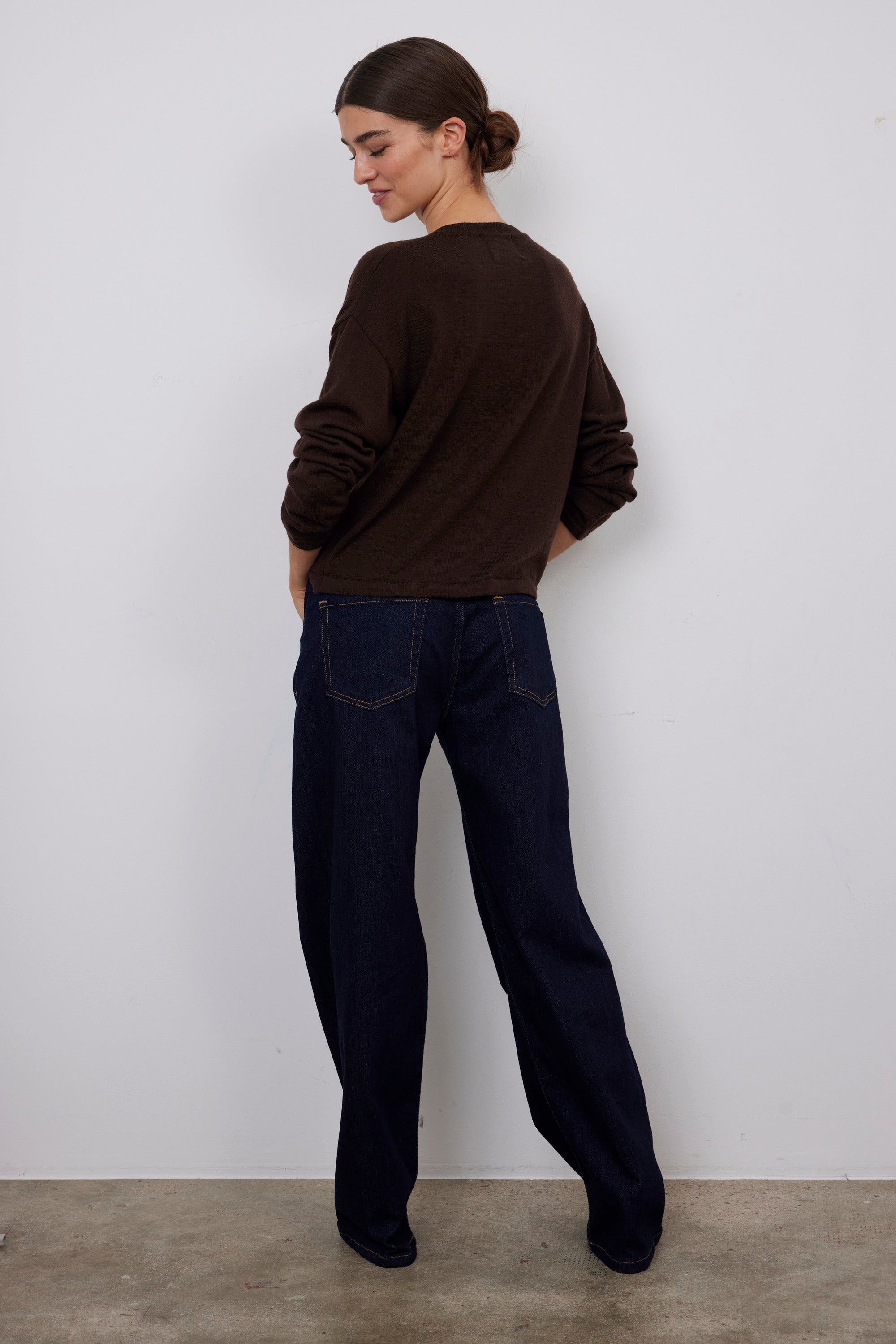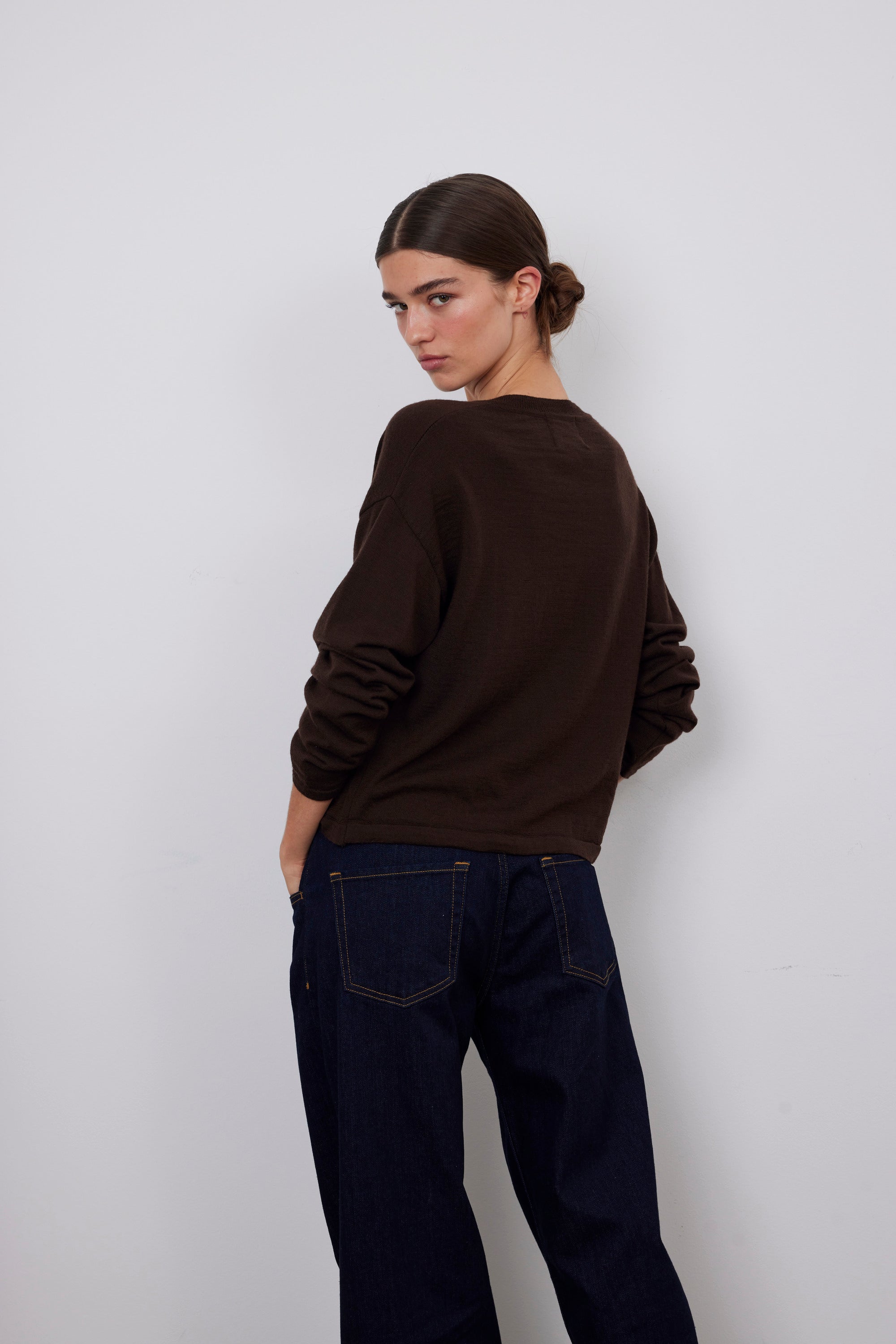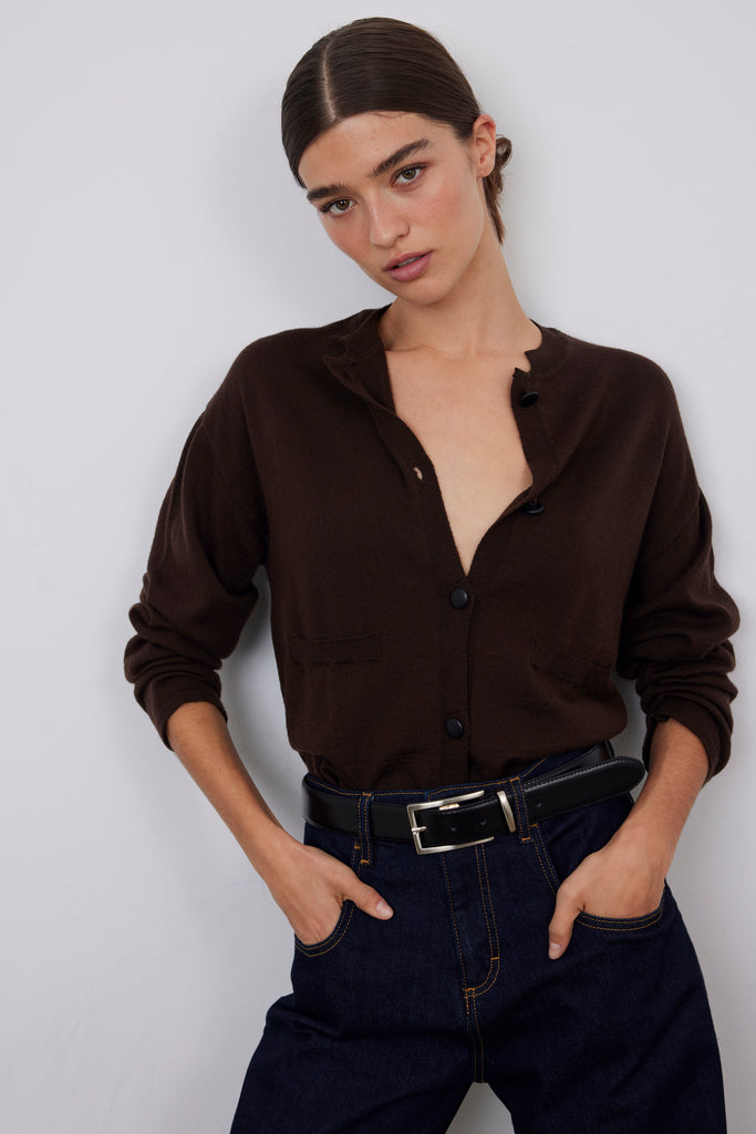 Cárdigan Colección Bad Habits. Cárdigan confeccionado en 100% lana merino, con botones forrados en piel vegana, ideal para un look cálido, elegante y consciente.
