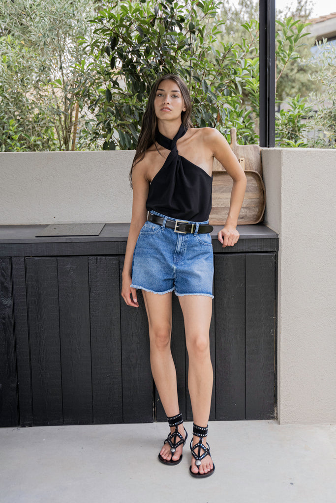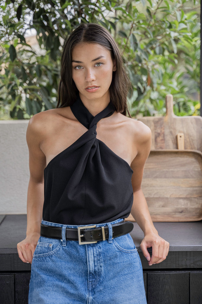 Top Colección Bad Habits. Top halter con nudo en el cuello, ideal para un look sofisticado y femenino con un toque distintivo en el escote.